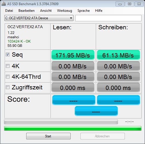 AS SSD Benchmark 1.5.3784.37609 ------------------------------ Name: SAMSUNG MMCRE64G8MXP-0VB Firmware: VBM1 Controller: iaStor Offset: 103424 K - OK Size: 59.62 GB Date: 5/10/2010 12:35:42 PM ------------------------------ Sequential: ------------------------------ Read: 87.17 MB/s Write: 63.86 MB/s ------------------------------ 4K: ------------------------------ Read: 12.52 MB/s Write: 0.28 MB/s ------------------------------ 4K-64Threads: ------------------------------ Read: 15.46 MB/s Write: 0.32 MB/s ------------------------------ Access Times: ------------------------------ Read: 0.363 ms Write: 11.346 ms ------------------------------ Score: ------------------------------ Read: 37 Write: 7 Total: 67 ------------------------------